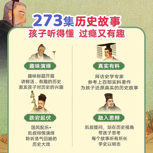 拥有丰富的历史故事,特别的转变成孩子可以听懂的方式,方便孩子更好了解历史。搭配高标准的音质,吐字清晰,听的更详细。
