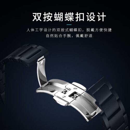此款手表采用镂空底盖设计,硬朗有型,尽情观赏机芯律动之美;运用双按蝴蝶扣设计,摘戴方便,生活更省心。