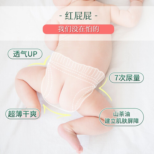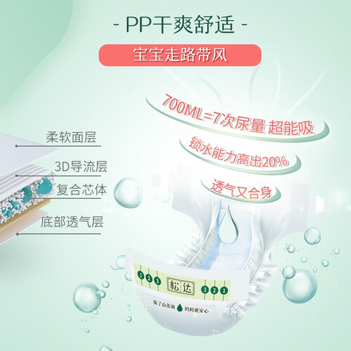 采用3D柔软无纺布面层,舒适亲肤,呵护宝宝敏感的小屁屁。还有轻薄高分子复合芯体,又薄吸收量又大,宝宝可以放心动。