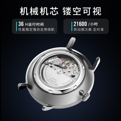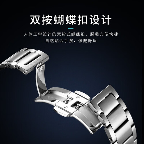 表底镂空可见,内置21颗宝石轴承机械机芯,走时稳定又可靠。结合人体工学设计的双按式蝴蝶扣,贴合手腕,佩戴更舒适。