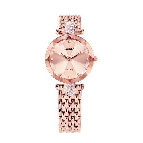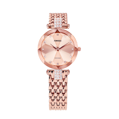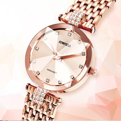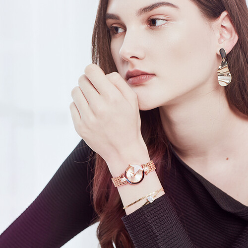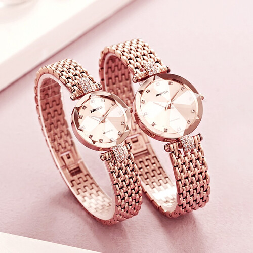 玫瑰金钢带设计,与镶钻点缀相结合,光泽璀璨亮丽,轻松秀出轻奢优雅风格,搭载优质石英机芯,性能稳定,走时准确可靠。