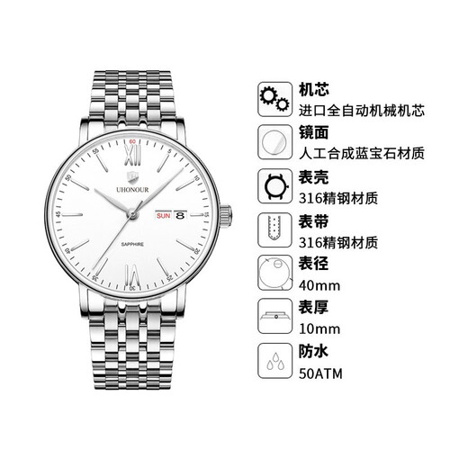 40mm简洁大表盘,搭载全自动进口机械机芯,给腕表稳定的动力支持。纤薄的表身设计,亲肤贴合,佩戴更加舒适。