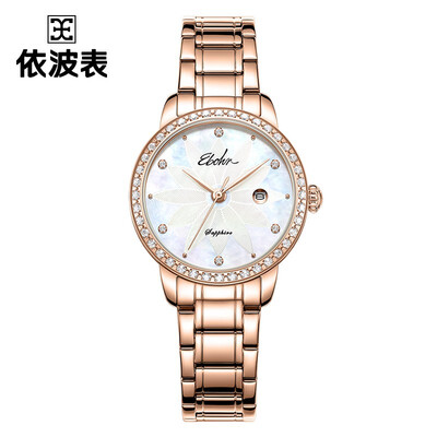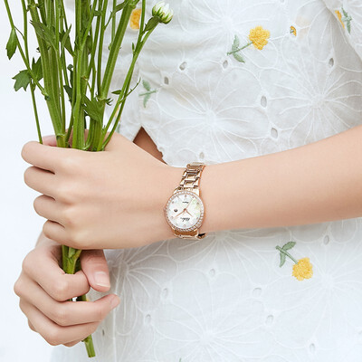 表盘和表盖上面都加入了太阳花图案,线条简约干练,充满了活力感;整体采用玫瑰金和白色搭配,戴在手上个性显白。