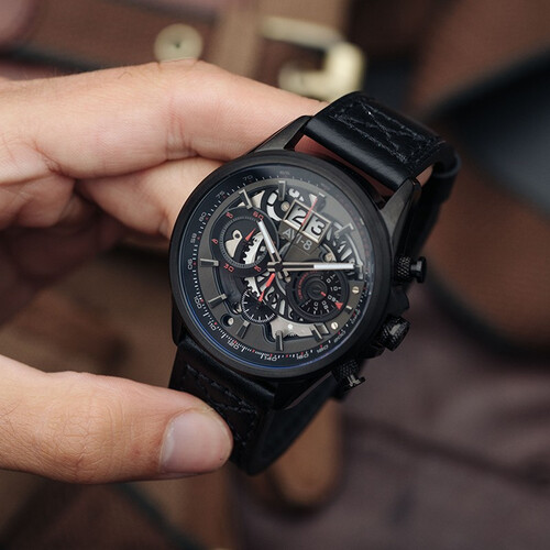 采用夜光材料,不管是白天,还是晚上,都清晰,轻松读时。镂空表盘结构,一目了然,可以满足更多人的需求。