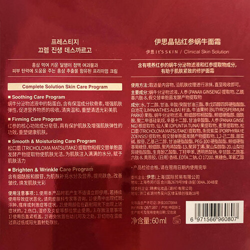 面霜提取了吃红参长大的蜗牛粘液为原料,双倍营养,修护功能更为强大。另外还添加了腺苷和熊果苷,修复肌肤的同时还能提亮肤色。
