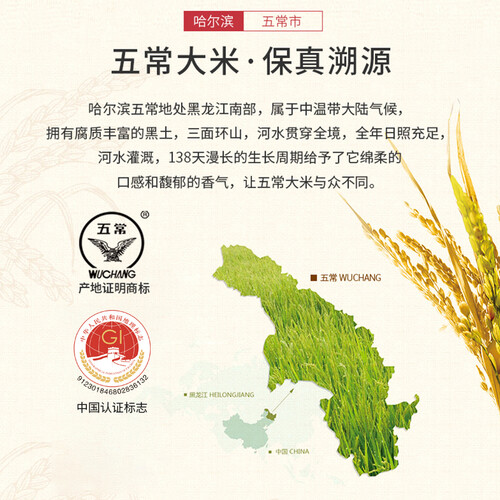 黑龙江优质的自然环境和肥沃的黑土地使得这款大米粒大饱满,煮熟后细腻软糯,入口带有微微的弹性和粘性。