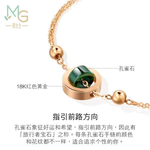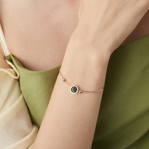 闪亮的18K金手链与雅致的翠绿色孔雀石相结合,打造出灵巧的双链双环样式,展现品牌卓越的品质追求。