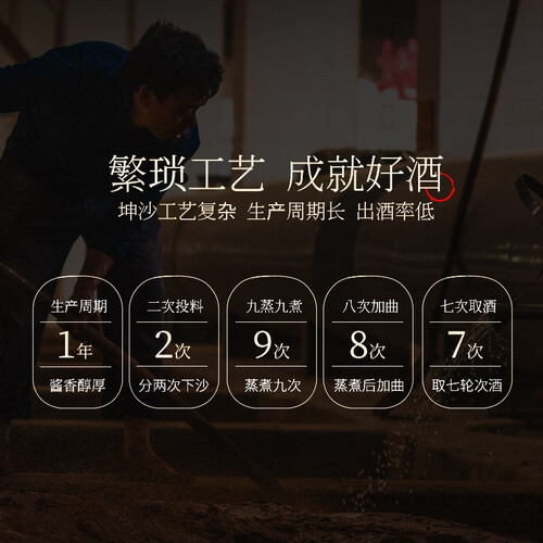 秉承工匠精神,从选粮、制曲、蒸馏等,多道工序不删不减,打造高品质好酒。酒体呈现天然微黄色,倒入杯中挂杯持久,爱不释口。