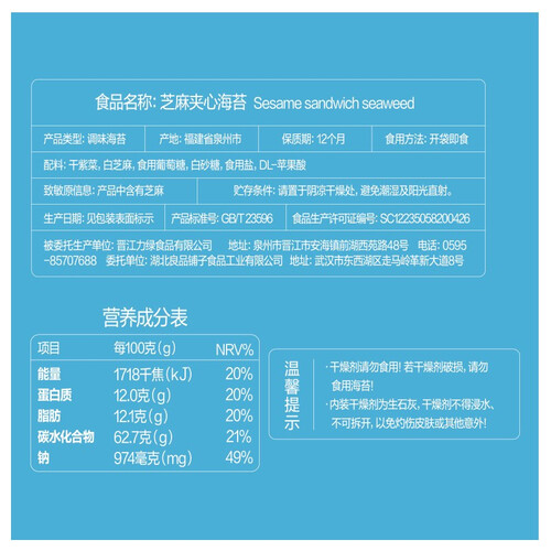 健康非油炸制作,有效降低身体负担,享受健康美味。浓郁香醇的芝麻包裹,提升了口感,结合酥脆的海苔,入口香脆。
