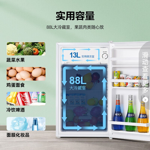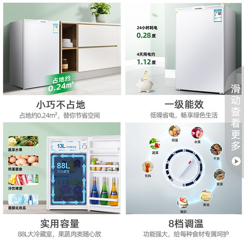小巧的机身却拥有实用的容量,88L大冷藏区可存储化妆品、蔬菜水果、鸡蛋等。一级能效,帮你节省用电。