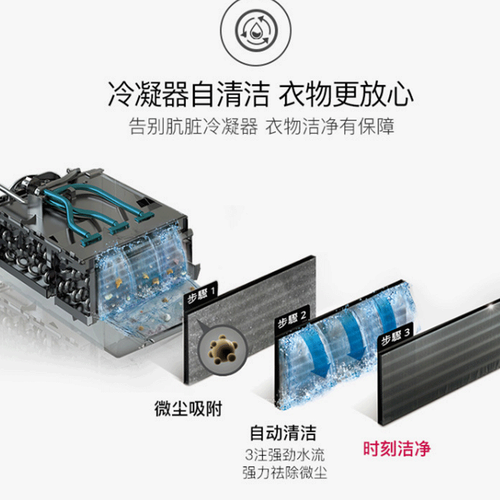 冷凝器自清洁,有效清除微尘,无惧残留,呵护日常穿衣洁净健康。双变频热泵,节能护衣,烘干后可直接穿着。