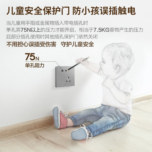 采用斜五孔设计,避免因间距小无法使用,可以同时进行充电,满足日常使用需求。设有儿童保护门,避免孩子不小心接触,无惧意外发生。