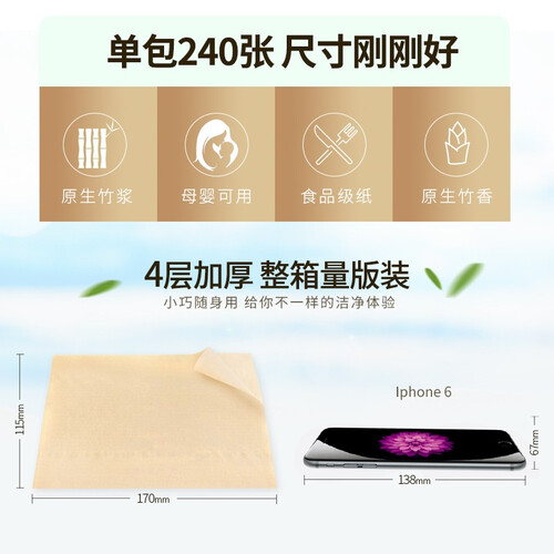 优质竹浆原材料,纸质十分柔韧,不掉屑,不易破,使用安心。四层加厚设计,更吸水,湿水不易破,避免掉纸屑的尴尬情况。