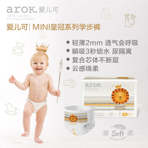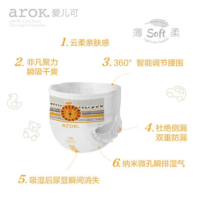 高吸水材质的芯体,锁住更多尿液,宝宝熟睡到天亮。云柔亲肤的面层,帮助呵护宝宝的娇嫩肌肤,带来柔软触感。