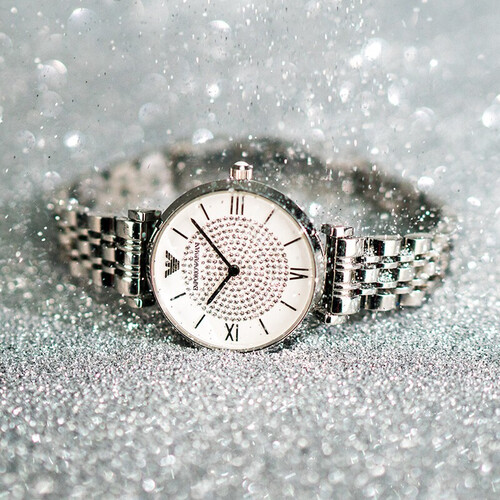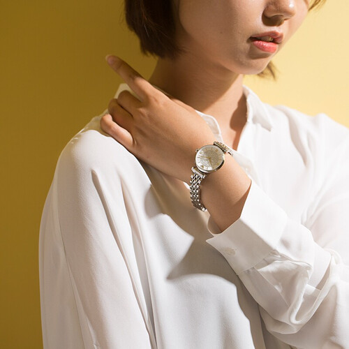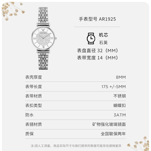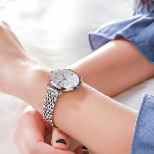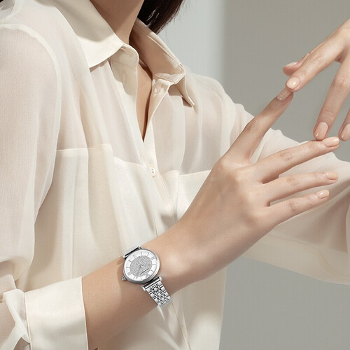 水晶表盘,矿物质玻璃。采用水晶镶嵌表盘设计,光泽感凸显柔美韵味。搭配上表面矿物质玻璃材质,抵挡意外撞击伤害。