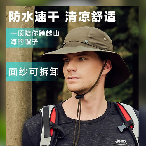 一款户外防晒帽,具有防水速干的效果,干爽舒适。可拆卸面纱设计,可作遮阳帽使用,也可可防晒防虫防尘。