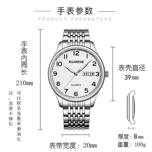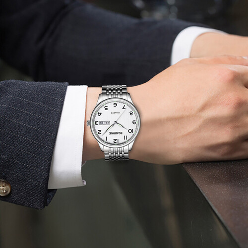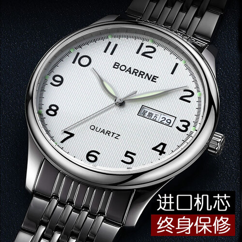 进口机芯搭配了双历窗口设计,走时稳定同时也方便日常看日期。字钉与指针都采用了夜光涂层,夜晚也能看清时间,贴心又实用。