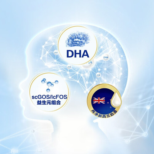 纯净的新西兰奶源绿色天然,获得多重安全认证,添加DHA、益生元等成分,能够促进宝宝的眼睛及脑部发育。
