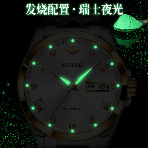表盘点缀双日历窗口,查看日期清晰准确,为生活增添便利。夜光显示功能,在暗光条件下也能清晰读时,更加方便实用。