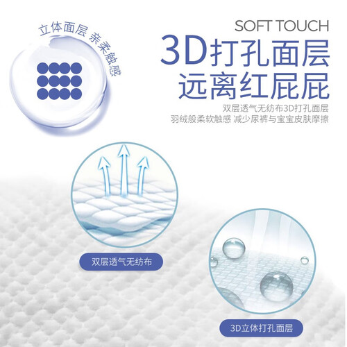 采用弱酸性配方,面层PH值接近人体肌肤PH值,亲肤不刺激;海量吸水高分子,单片吸收量较大,无需频繁更换。