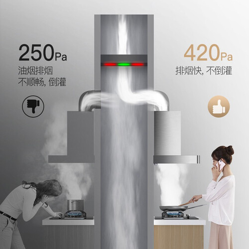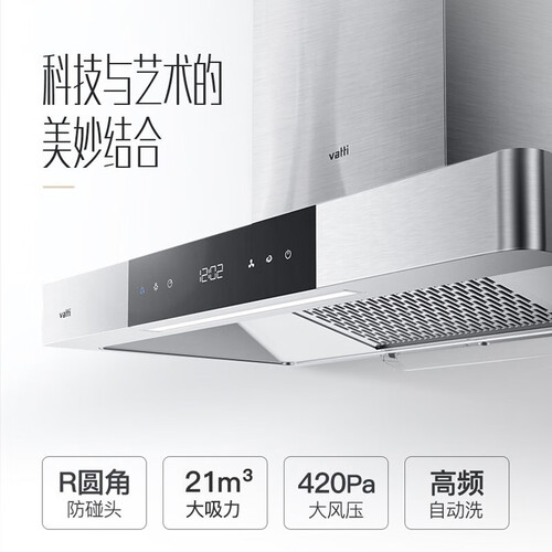 R圆角的外形,防止碰头,细节更贴心。大风压搭配大吸力,排烟更迅速,有效防止倒灌。高频自动洗功能,解除手洗麻烦。