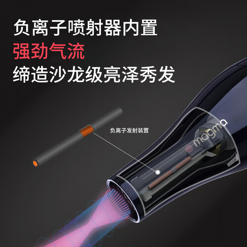 大功率劲风设计,提高风速和风量,快速干发无需久等,节约时间。负离子喷射,减少静电积聚,锁住秀发水分,滋润营养。