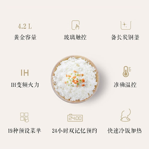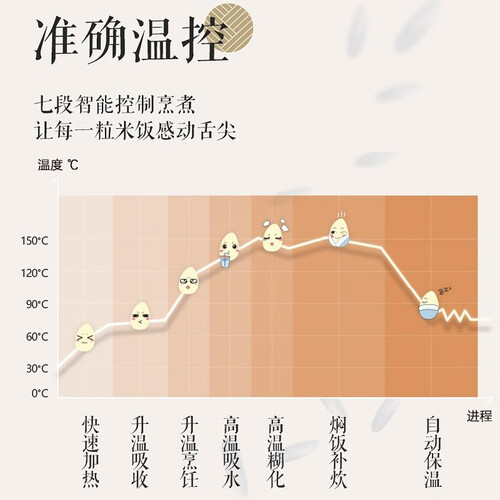控制面板使用透明玻璃材质,没有缝隙容易清洁,而且也更美观。内置变频电磁加热系统,能够加速米饭成熟速度,同时口感软糯。