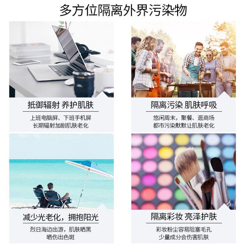 采取防晒剂包裹技术,将吸收紫外线的吸收剂包裹起来,从而达到有效防晒;除此之外还能抗蓝光功效,让人安心办公。