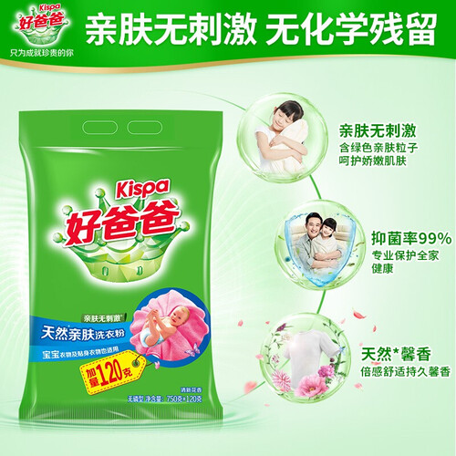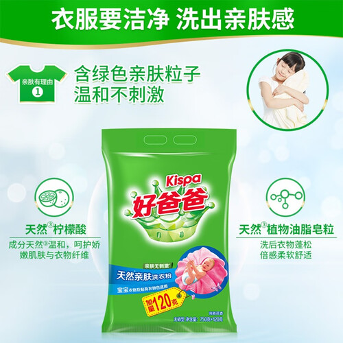 洗衣粉颗粒细腻易溶解、易漂净,洗后无化学残留,不会刺激皮肤,肌肤敏感人士放心选择。