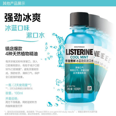 提取薄荷精粹,保持口气清新。搭配桉叶油素成分,有效减少牙菌斑,清凉口感,缓解口气。温和0酒精,安全呵护口腔。