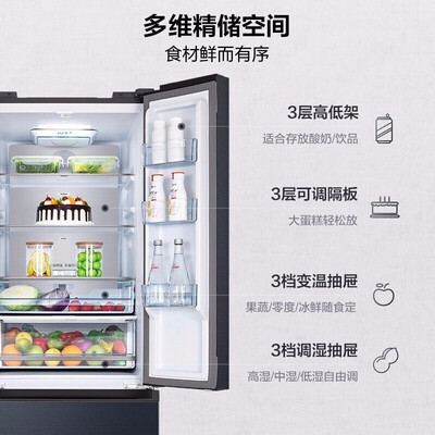 这款冰箱内置净味装置,可吸附异味,使箱内空气更清新。大容量设计,一次采购用两周,满足全家人的营养需求。