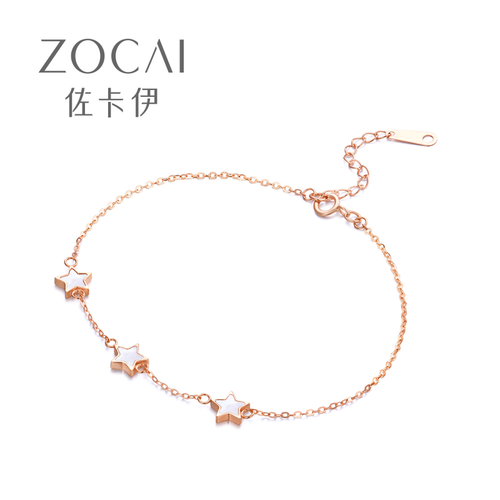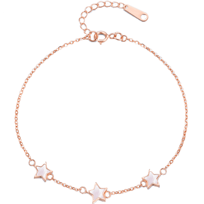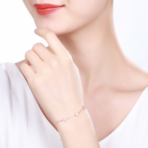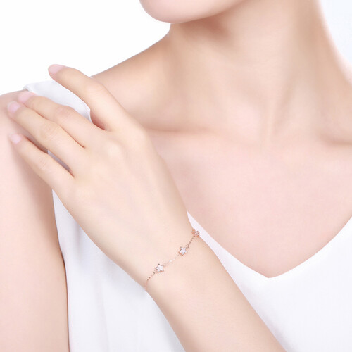 光泽温暖的玫瑰金手链,甄选18K金材质打造,不易过敏,佩戴更安心。折射出幻彩纹理的星星饰物,个性惹眼,充满浪漫时尚感。