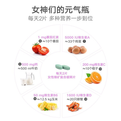 每片富含维矿物质+抗氧化组合等56种营养素,专为女性打造的复合维生素,消除加速老化自由基,提高抗氧化能力,焕活好容颜。