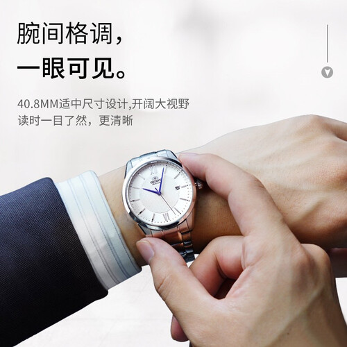 内部搭载的自动机械机芯,满动能可连续运行40小时左右,且走时更准确可靠。时尚大气的白盘设计,展现出都市男士稳重的气质。
