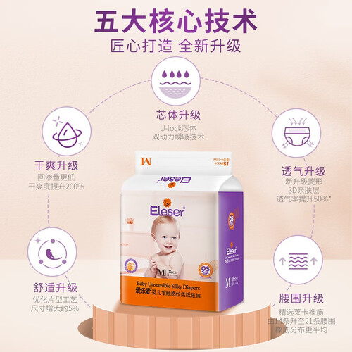 高透气亲肤面层设计,能迅速排湿,保证小屁屁时刻干爽不潮。内置进口吸收高分子,海量瞬吸,减少更换频率。
