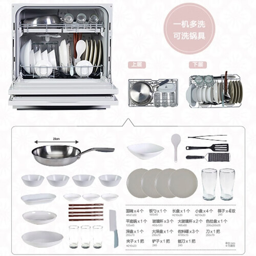 搭配双层独立碗篮,合理利用内部空间,一机多洗,可同时洗锅具;收纳能力强,多套餐具轻松摆放,拿取更方便。