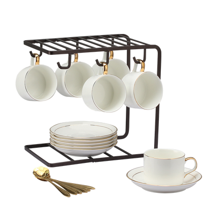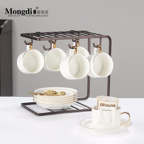 人体工学手柄,弧度圆润,契合手型;杯架收纳,整齐不占地方,更实用;配套不锈钢咖啡勺,金色轻奢,小巧耐用。