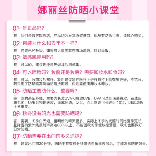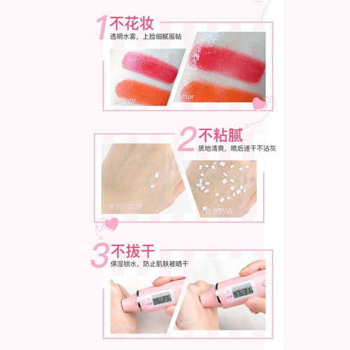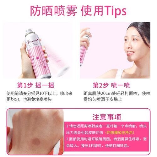 喷雾细密轻盈,可以均匀接触肌肤,同时在肌肤表层形成防晒膜。同时蕴含美白精华,可以深层保湿美白肌肤。