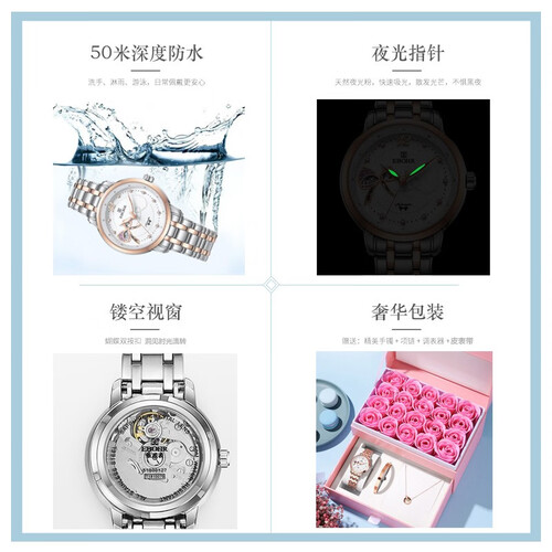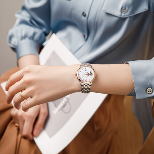 表盘上采用了蝴蝶结形状的镂空,唯美灵动,搭配柳叶状的指针,更加雅致,12点位采用锆石镶嵌,更加闪耀。