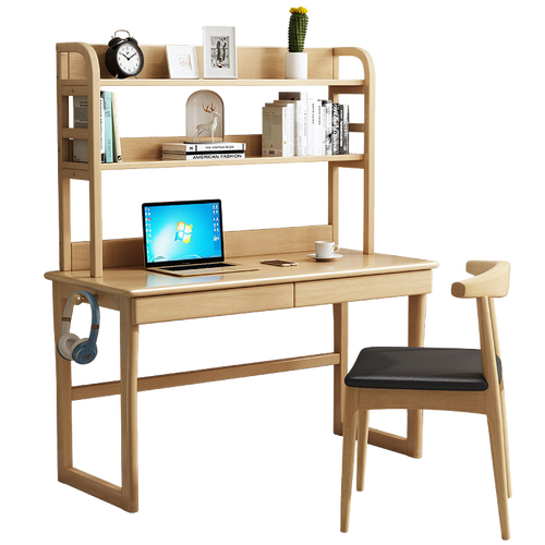 书桌整体选取泰国进口橡胶木,呈现出原木色泽,看起来更为温馨舒适。带有一体化的书架设计,便于放置物品。