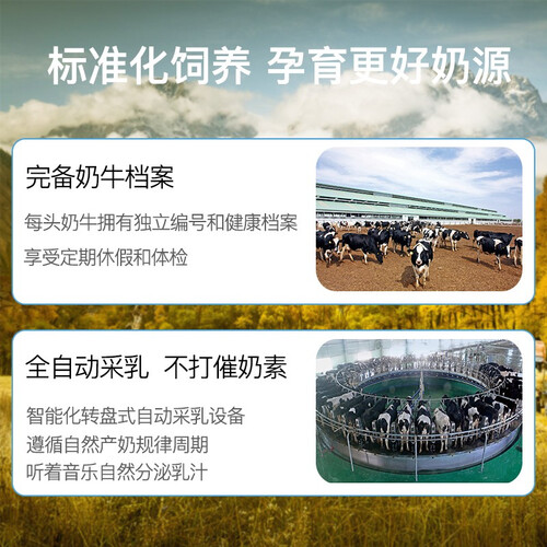 优选了自有牧场奶牛产奶,奶源品质天然。同时确保无防腐剂和无色素的添加,喝得安心,伴随孩子的健康成长。