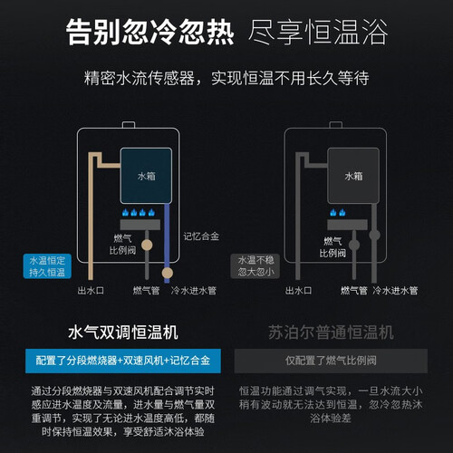 水气双调精准控温,恒温沐浴呵护宝宝。多分段燃烧按需选择,夏日清凉不闷热,冬日温暖不泛寒。安全守护系统,全家沐浴更安心。