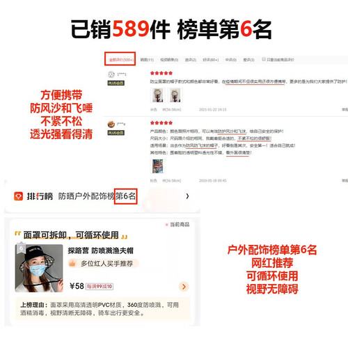 面罩采用高清透明PVC材质,360度防喷溅,可用酒精消毒,视野清晰无障碍,骑车出行更安全。