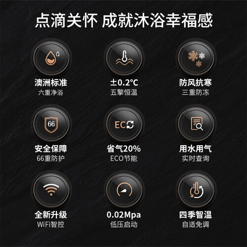 采用五擎恒温技术设计,智能调节水温,给你带来更加舒适的恒温沐浴之享。水箱采用三重防冻技术,及时在寒冷的冬季也能酣畅热水。