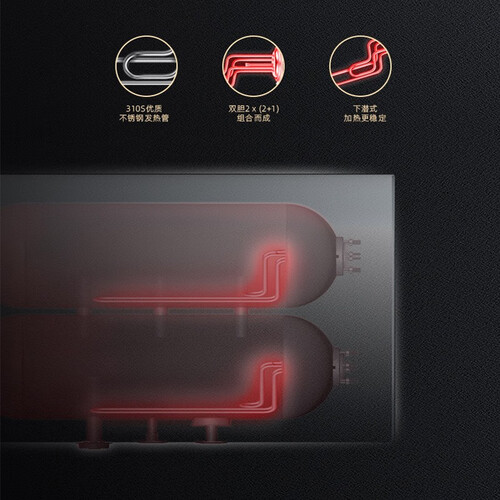 纤薄款双胆设计,更薄的机身,更快的加热体验,同时不占用过多空间。另外采用双胆双管,以及不锈钢发热引擎。