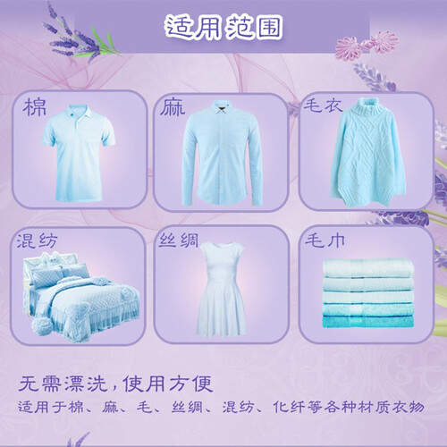 含天然植物柔顺成分,让衣物蓬松棉柔,接触皮肤更舒适,有效减少衣物褶皱,让衣物靓丽如新。性质温和无刺激,儿童衣物均可使用。