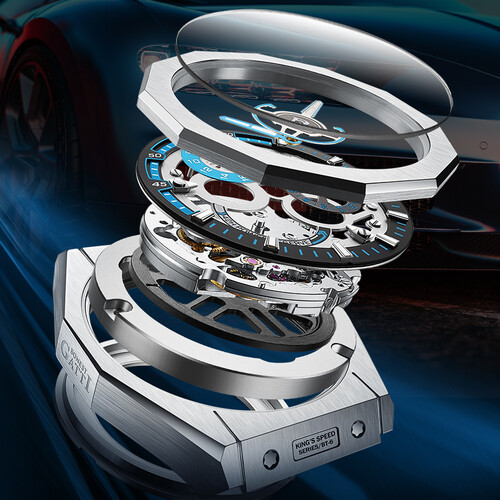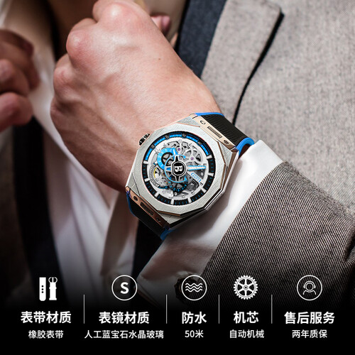 机械感镂空表盘,立体造型更具个性。生活防水功能,贴合日常需求。不锈钢材质表框,佩戴起来舒适有型。