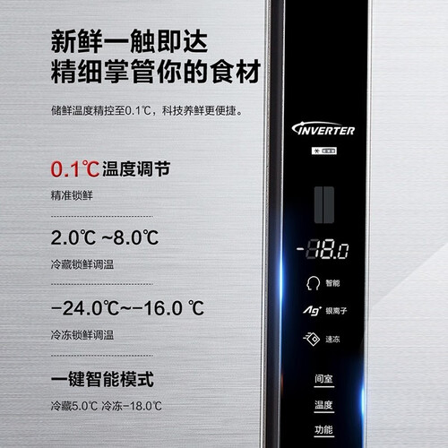 银离子抗菌装置,能有效抑制细菌产生,时刻保持冰箱长效清新,钢化玻璃的面板,颜值高,轻松容纳大家庭一周所需食材。