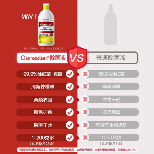高浓缩配方,一瓶抵4瓶。可以99.9%消除细菌及真菌,再也不怕衣物脏污。还有PH7中性水溶性配方,护衣不伤手。