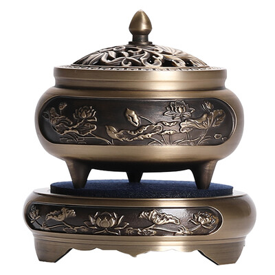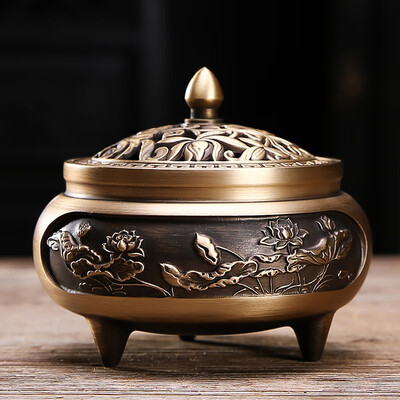 圆润的纯铜香炉,炉上雕刻富贵花纹,造型别致妙不可言。仿古拉丝工艺,边角转折处摸着圆润,匠人打造富有古意。